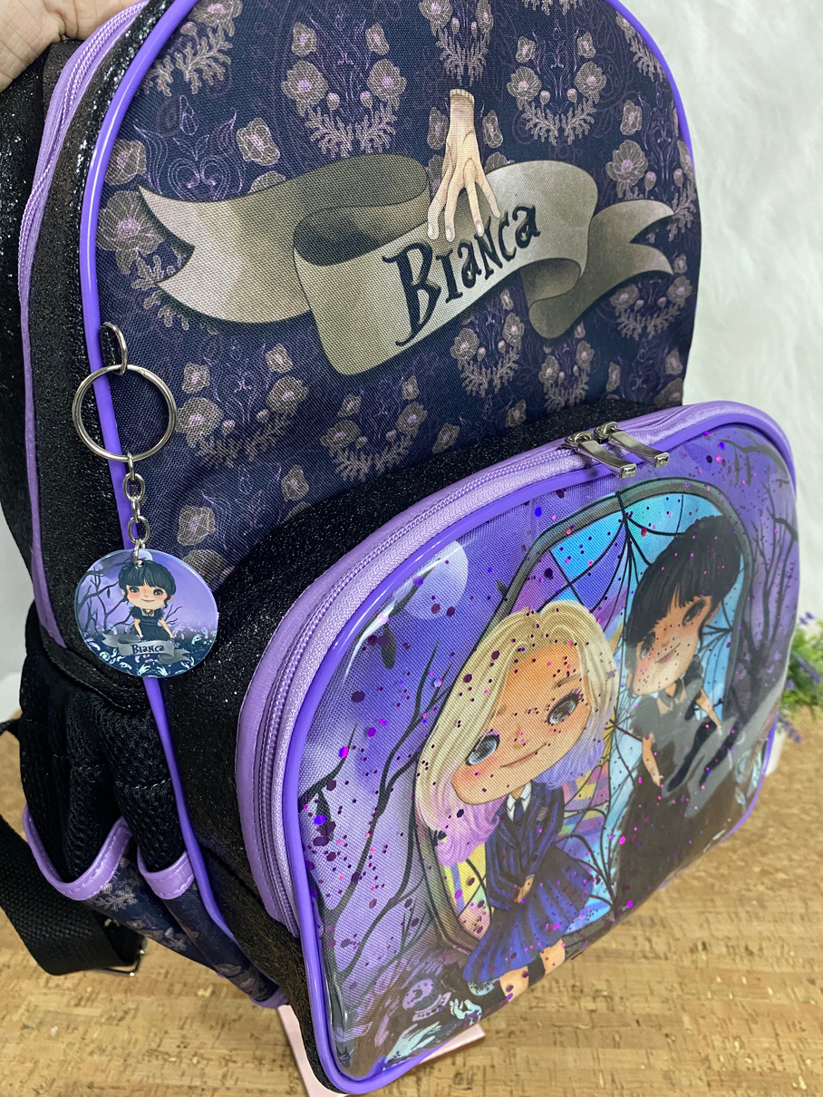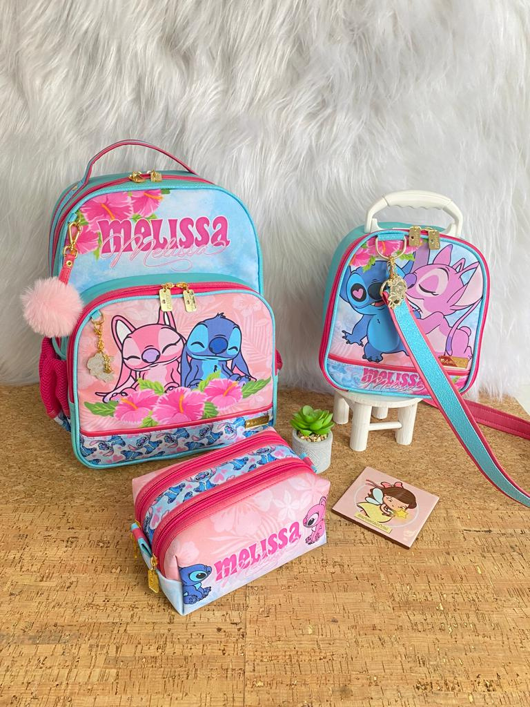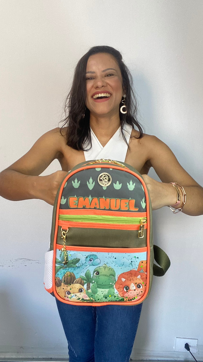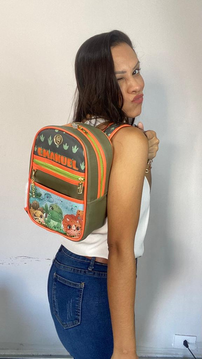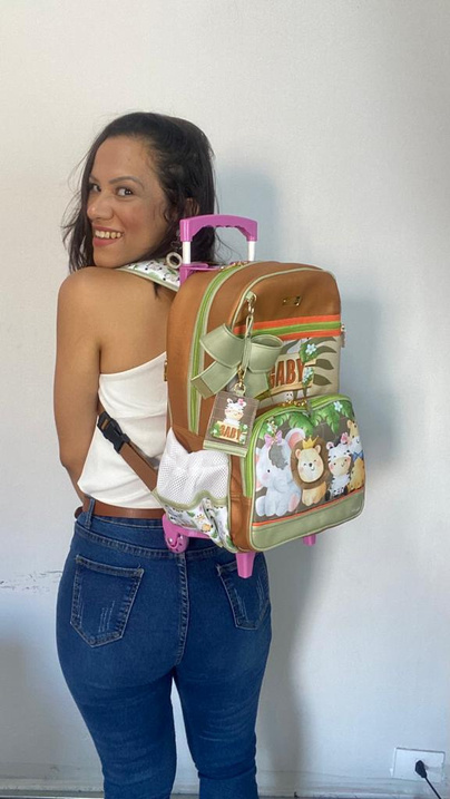 Mochila grande, com dois bolsos frontais, bolsos laterais, suporte com bolso para o carrinho, e aplicação do carrinho de rodinhas.